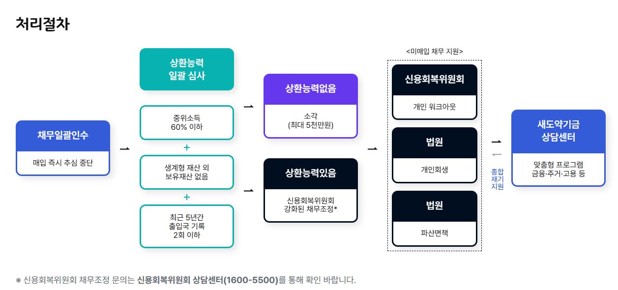 - 부실우려차주 (90일 미만 연체 등): 곧 연체가 발생할 위기에 처했거나 단기 연체 중인 분들입니다. 원금 감면은 없지만, 고금리 대출을 저금리로 바꿔주고 상환 기간을 최대 20년(부동산 담보)까지 늘려 매월 갚아야 할 돈을 줄여줍니다.